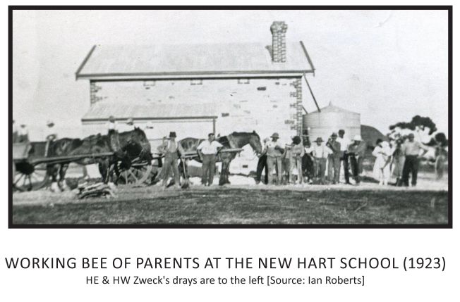 The hall continued to be used as a school until 1922, when a new school building was opened by the Education Department, on Section 485W at Hart Siding on land donated by Mrs HE Zweck. This second school is located at 1092 Hart Road.